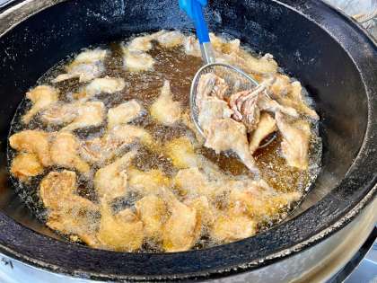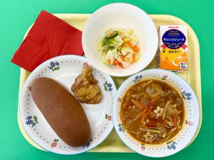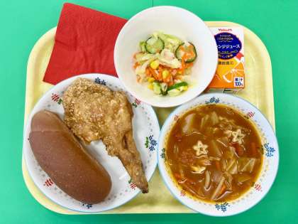 いよいよ今日は2学期の給食の最終日でした。いつも学期末には、子供たちが「今学期もがんばって良かったな」と思えるような、嬉しくなるような給食を出せるよう心がけています。ここ数年、2学期の最終日はフライドチキンが定番なのですが、昨年は低学年の児童にはボリュームが多すぎたり、骨付きのチキンが食べにくいという反省がありました。そこで今年は、低学年は骨無しのフライドチキン、中学年以上は骨付きのフライドチキンを提供してみました。