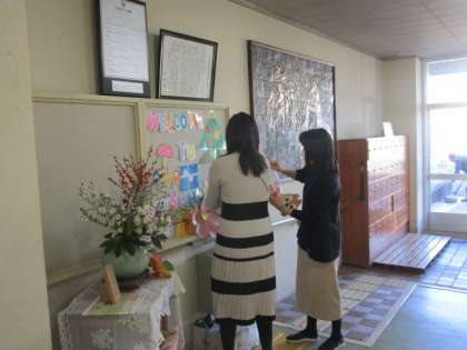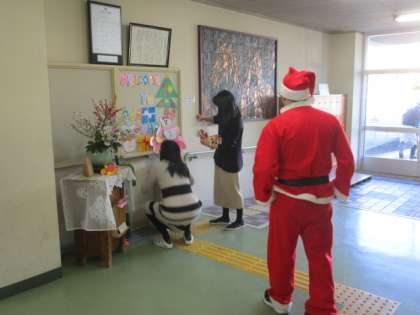 クリスマス前ですので、玄関の掲示物をクリスマスバージョンに変えていただきました。そして、ALTがサンタクロースの衣裳で英語の授業をしてくださいました。