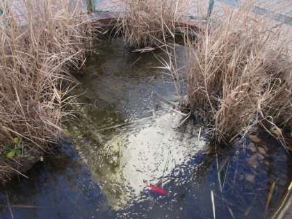 とても寒い朝でした。朝の眼鏡池には薄く氷が張っており、氷の下では金魚がじっと寒さに耐えているようでした。