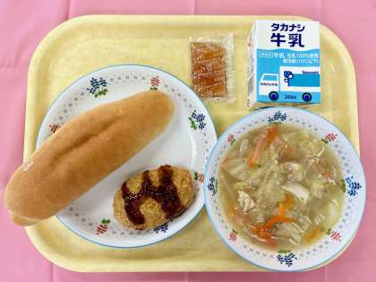 今日は、給食の歴史献立第二段として、昭和25年頃の給食を再現しました。当時は戦後で食糧などが不足しており、アメリカから輸入した小麦粉と脱脂粉乳を使って給食が提供されました。主食は毎日大きなコッペパン、おかずは脱脂粉乳を使ったシチューやくじらの竜田揚げ、コロッケなどが組み合わせられました。