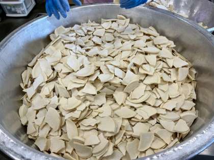 今日は、久しぶりにせんべい汁を作りました。せんべい汁は、青森県の郷土料理で、青森や岩手の伝統食品である「南部せんべい」を入れた汁物のことです。南部せんべいは小麦粉と塩、水を混ぜた生地を鉄の型で焼いたもので、昔は冷害などで米が不足しやすい地域の貴重な保存食でした。