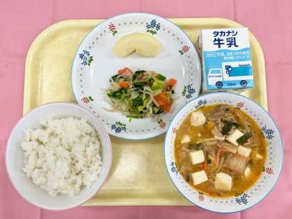 今日は、給食流のスンドゥブを作りました。本場韓国のスンドゥブのように貝は入っていませんが、煮干しで取っただしをベースに、キムチやみそを加えて仕上げます。給食のキムチはほとんど辛みが無いので、マイルドな味です。このスンドゥブのスープがとてもごはんに合う味で、特に中学年から高学年の児童に大人気です。今回一緒に組み合わせたごま油とにんにくの香りを効かせたナムルも人気で、皆さんよく食べてきてくれました。