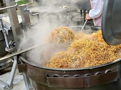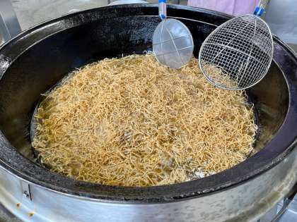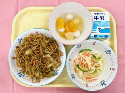 今日は人気のソース焼きそばを作りました。町田の給食のソース焼きそばは、給食用の蒸し中華麺を油で揚げて、ソース味に炒めた具と混ぜ合わせ、蒸らして仕上げます。