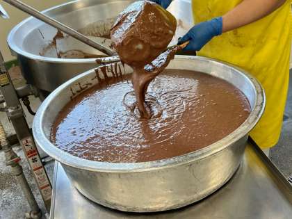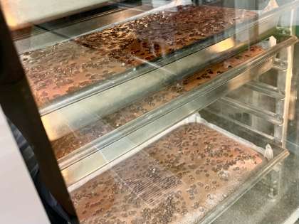 大きな天板に流して焼いたので、全部で45分ほど焼き時間があったのですが、その間甘くて良い香りが給食室や給食室前の廊下中に漂っていて、児童の喜ぶ声がたくさん聞こえました。ここ何年か給食でブラウニーを作っていなかったので、少し特別感のあるデザートになったようです。