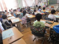 写真は、5年生の図工と先週に続き今日も行った1年生の折り紙教室の様子です。