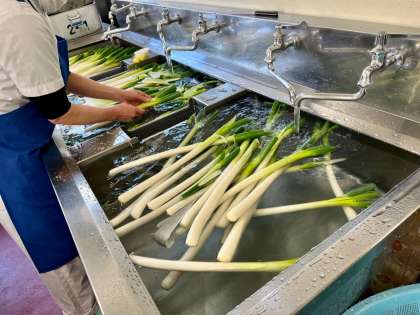 先週は雨が降ったり、最近は風が強い日が続いているので、ねぎの緑の部分に砂がついている物もありましたが、たくさんの量を調理員さんたちが丁寧に洗って、下処理をしてくれました。
