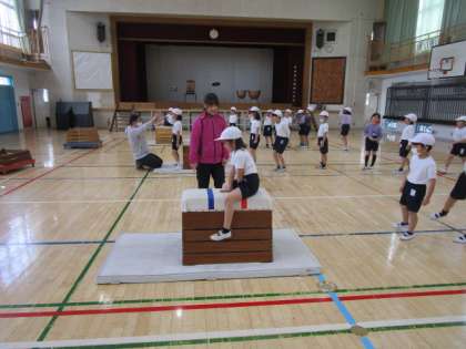 1年生で跳び箱教室を行いました。ゲストティーチャーの方にコツを教わりながら何度も繰り返し練習し上達しました。