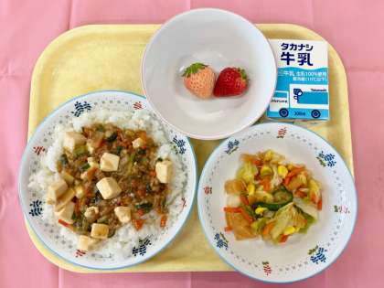 そして、今日のいちごは赤いいちごの栃木県産「とちあいか」と、白いいちごの茨城県産「淡雪」を使用して紅白いちごにしました。久しぶりのいちごの登場に、たくさんの児童が喜んでくれました。食べ比べをしている児童も見られ、色だけでなく味や食感の違いも感じてもらえたと思います。