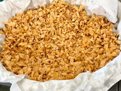 今日は、6年生に聞いた思い出の給食アンケートで、野菜のおかずの圧倒的支持を受けたパリパリサラダを作りました。揚げたシューマイの皮を加えたサラダなのですが、このパリパリが絶妙にサラダとマッチして、野菜をおいしく食べられます。中高学年はもちろんですが、1年生の児童も「おいしい!!」と言ってたくさんおかわりをしてくれました。