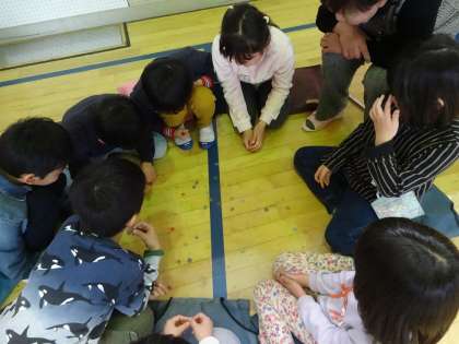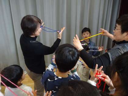 2月17日(月)に昔遊びをしました。地域の方々をお招きして、昔から日本に伝わる遊びを教えていただきました。使い方や遊び方を教えてもらい、みんなで練習することで、楽しみながらできるようになりました。