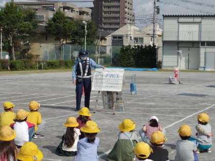 お話を聞いた後、実際に校庭にかいた横断歩道で道路を渡る練習をしました。教えて頂いたことをしっかり守って安全に登下校させたいと思います。