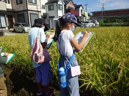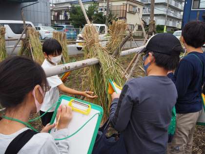 社会科「米づくりのさかんな地域」では、米づくりにおける農家の工夫や努力について学習しています。今回東京都では数少ない稲作をしている宮本様の田んぼに見学に行かせていただきました。子供たちのために稲を残してくださり、実際に稲穂を見たり、宮本様へ質問をしたりしました。宮本様の米づくりにおける工夫や努力、苦労を知ることができ、学習が深まりました。