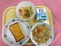 ~今日の献立~牛乳はちみつレモントースト東京都産糸寒天サラダウィンナーのポトフ