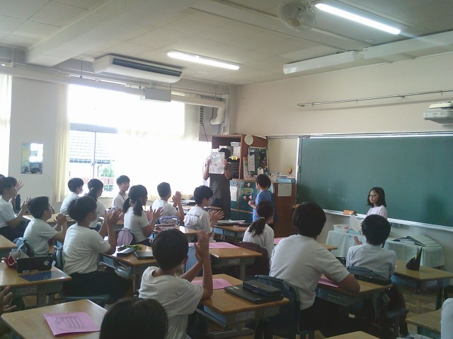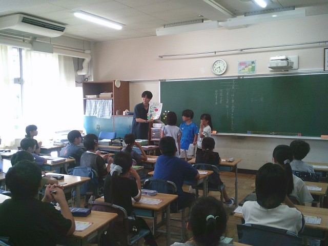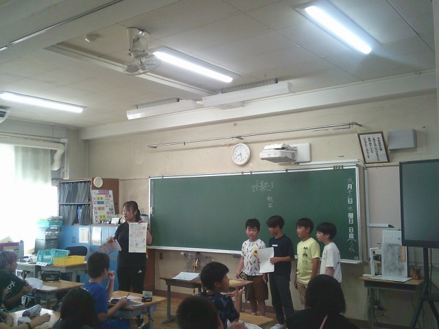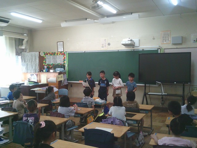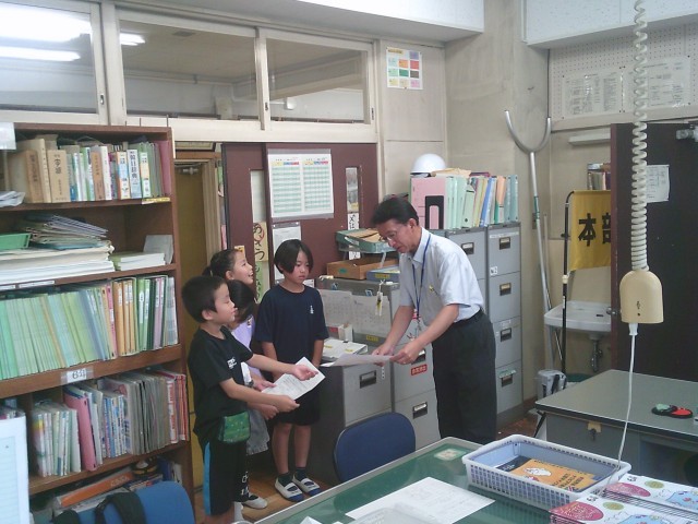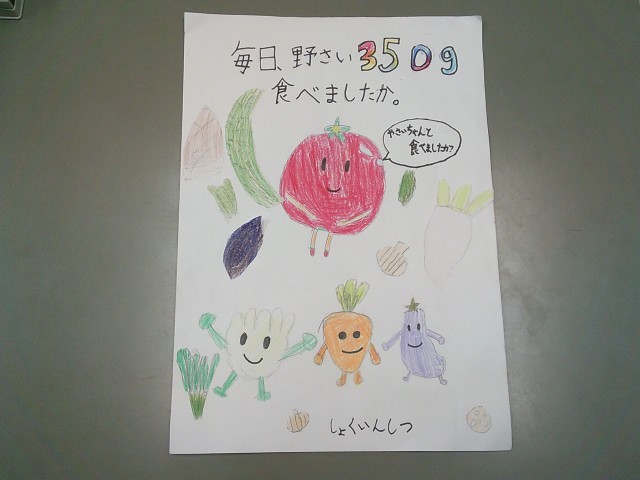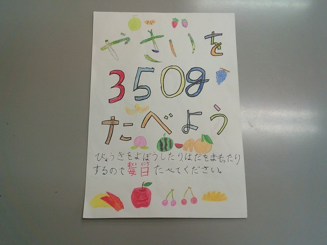 18日(木)の朝、3年生は手作りのポスターを届けに行きました。内容は、1学期に学習した「野菜を食べよう」です。2階のランチルームに集合してから、グループごとに届けに出かけました。職員室では副校長先生が受け取りました。