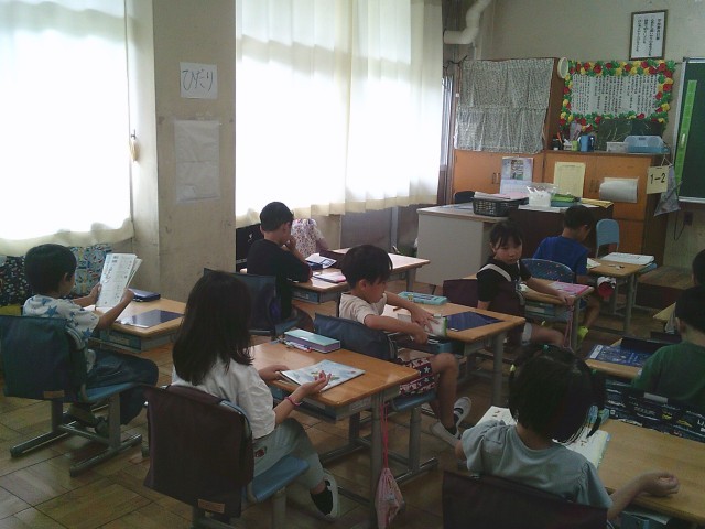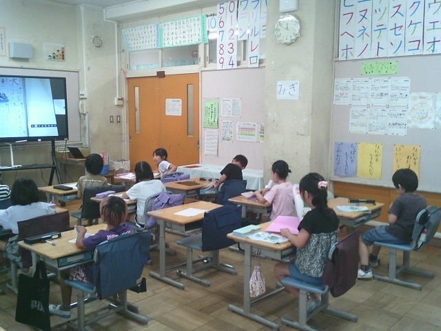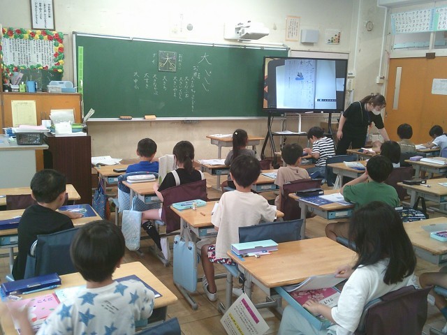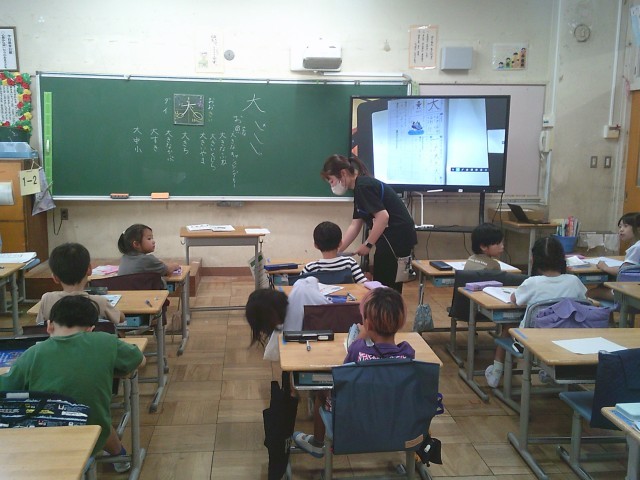 18日(木)4時間目、1年2組は国語の時間でした。最初に漢字の学習をしました。今回は、「大」でした。書き順や読み方を知り、漢字学習帳に書きました。次に、教科書を出して「やくそく」の続きをしました。