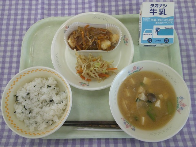 2日(木)の献立は、わかめご飯、鯛の野菜あんかけ、もやしとキャベツのおひたし、大根と油揚げのみそ汁、牛乳です。