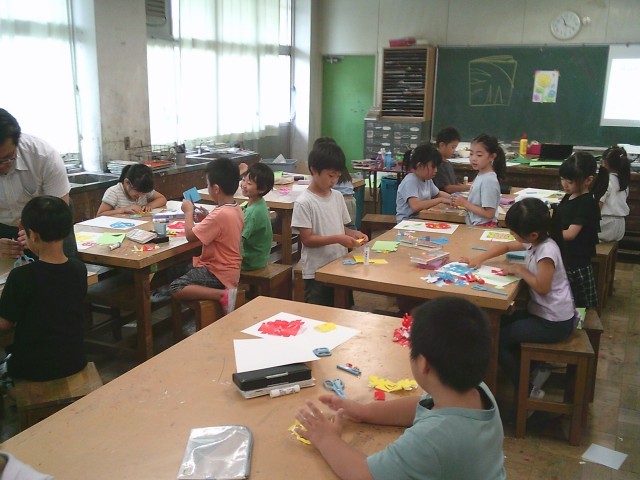 3日(金)3・4時間目、2年2組は図画工作の時間でした。今回は「はなの おやこ」と題した作品づくりをしました。折り紙で大きな花と小さな花を作り、さらに茎や葉を作りました。それらを白い画用紙に糊付けして、チョークで背景の色塗りをしました。
