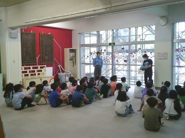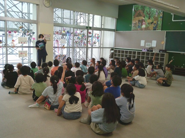 3日(金)5時間目、2年生は合同で1階プレイルームに集合しました。11月に行う「学習発表会」について、1組の先生から話を聞きました。2年生にとって初めての学習発表会です。これまで学習した中から「スイミー」に取り組むことになりました。