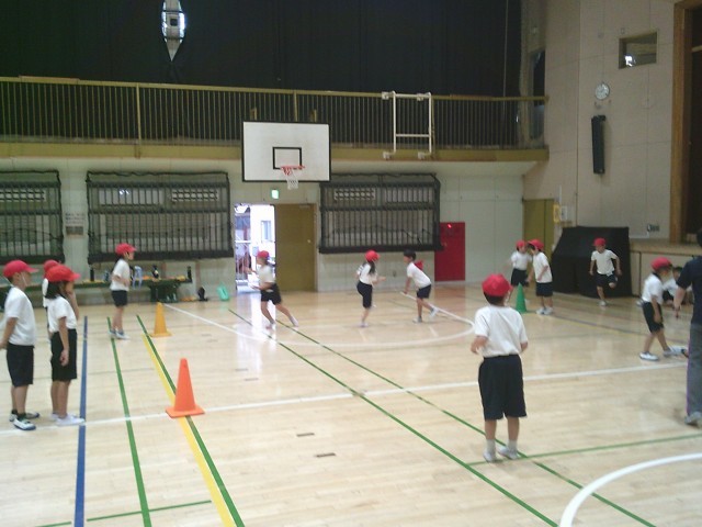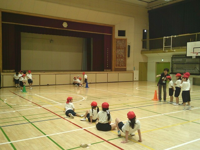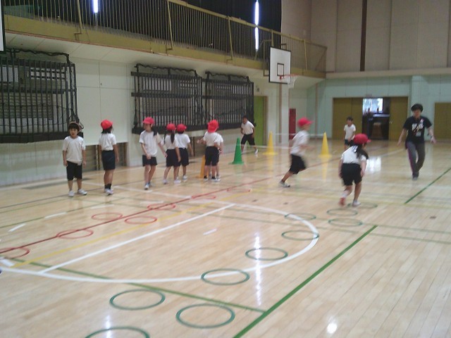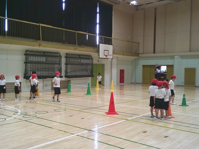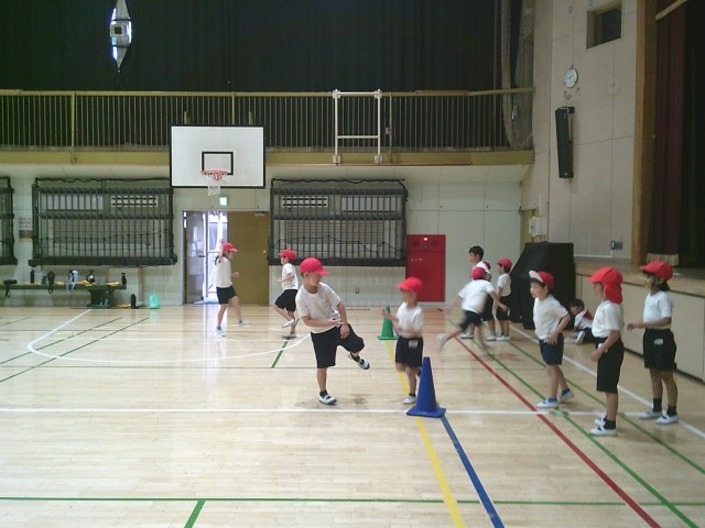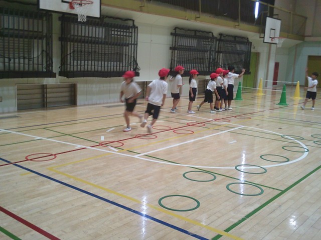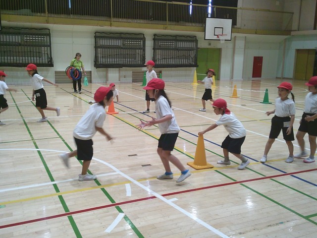 3日(金)5時間目、1年1組は体育の時間でした。体育館で「とびっこあそび」をしました。前半は「ケンケンどんじゃんけん」をしました。片足でケンケンしながら相手とじゃんけんをします。後半は、ケンパとゴムとびをしました。ケンパは、少し間が空いているバージョンもあり、子どもたちはうんと力をためてジャンプしていました。