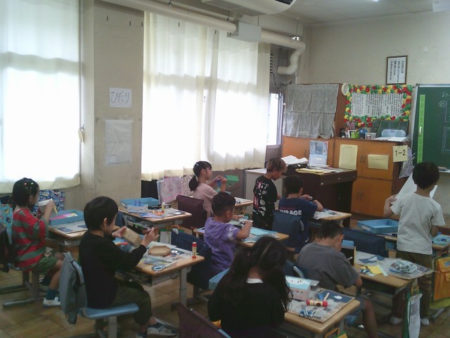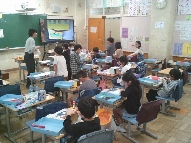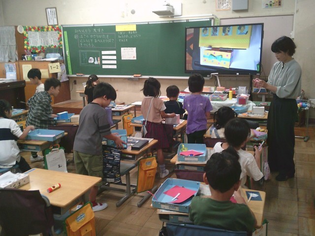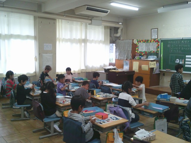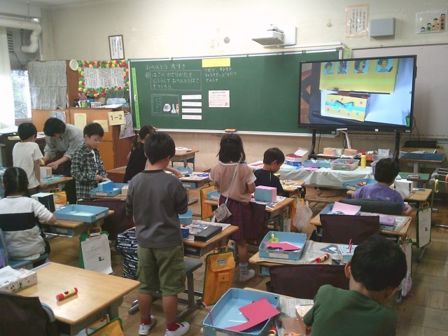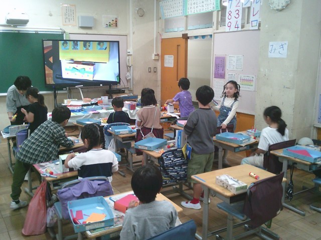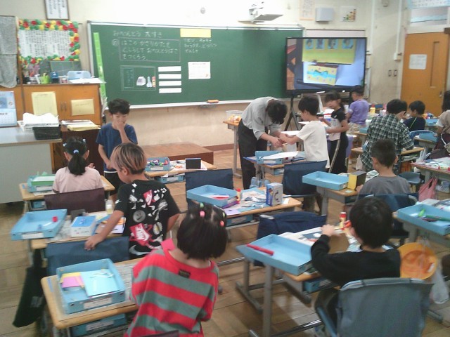 7日(火)1・2時間目、1年2組は図画工作の時間でした。「おべんとう 大すき」と題して工作をしました。家から持ってきたお菓子などの空き箱をお弁当箱に変身させていきます。子どもたちは、箱の飾り方を工夫しながら取り組んでいました。