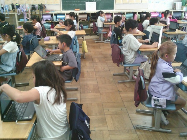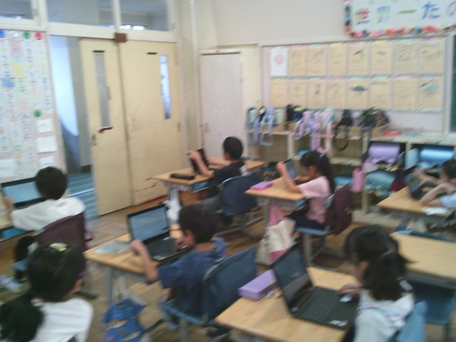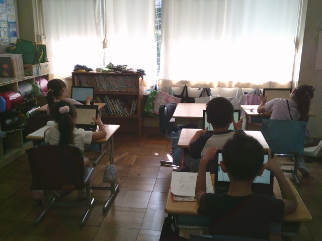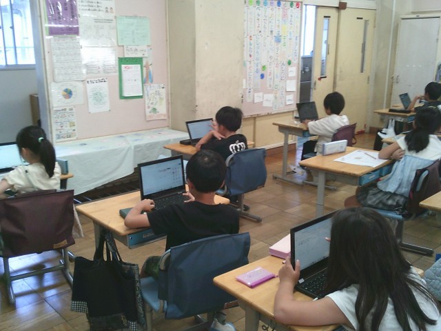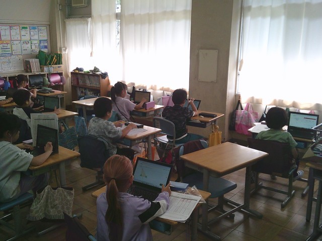 8日(水)2時間目、2年2組は国語の時間でした。「どうぶつ園の じゅうい」のワークテストをしました。廊下側と窓側とに向きを変え、さらに机と机を離しました。ワークテストの見直しまで済んだ人から提出し、その後はタブレット端末を出してドリルソフトに取り組みました。イヤホンを使用してイーボードで学習をする人もいました。
