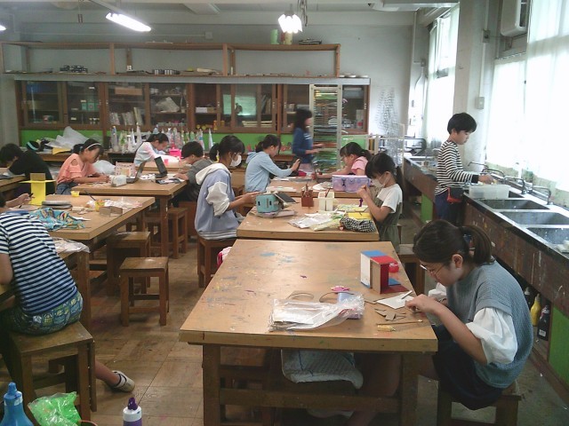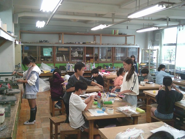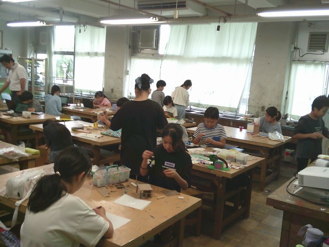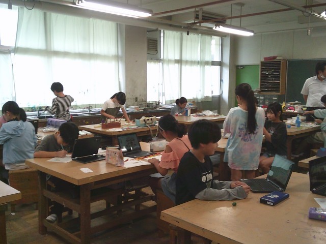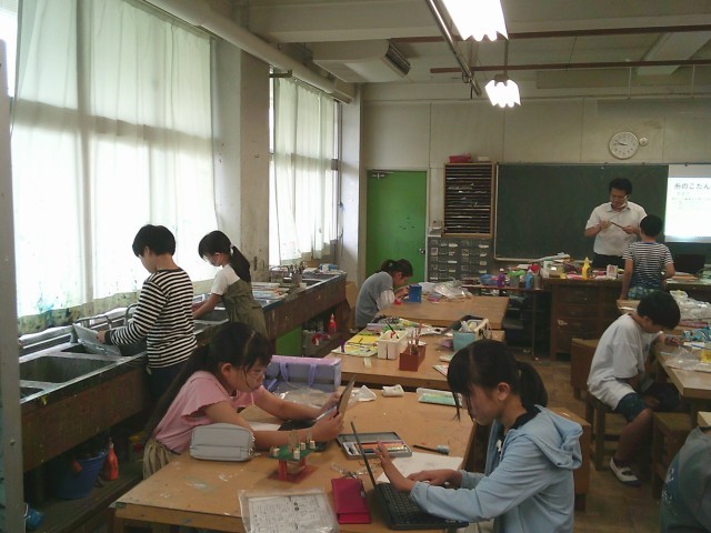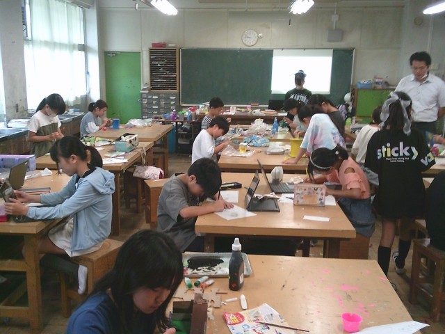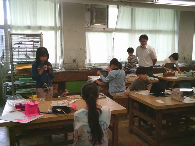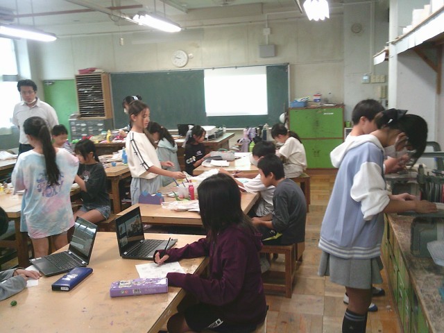 9日(木)1・2時間目、5年2組は図画工作の時間でした。「糸のこたん検隊」と題した工作の続きをしていますが、完成に近付いていました。電動のこぎりで切った木片の組み立てが終わり、色塗りもあと少しのところまできていました。完成した人は、タブレット端末を使って動物のスケッチをしていました。