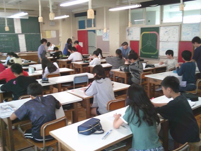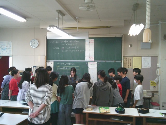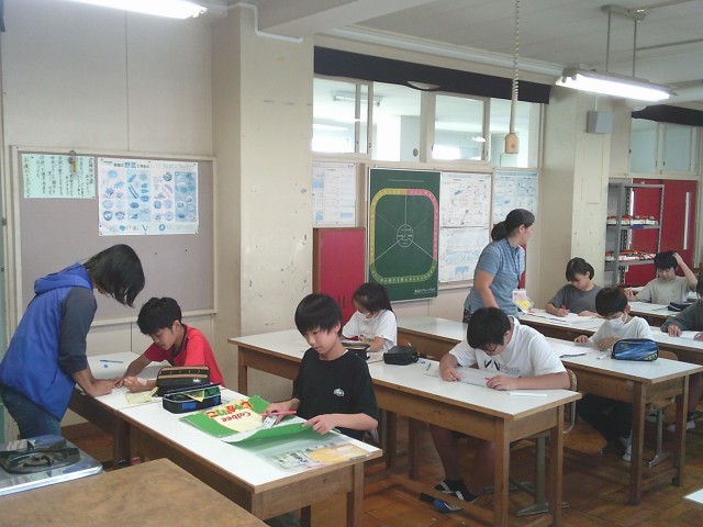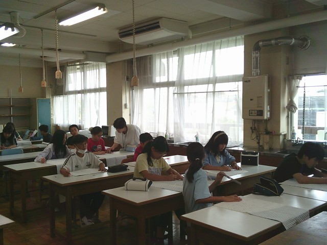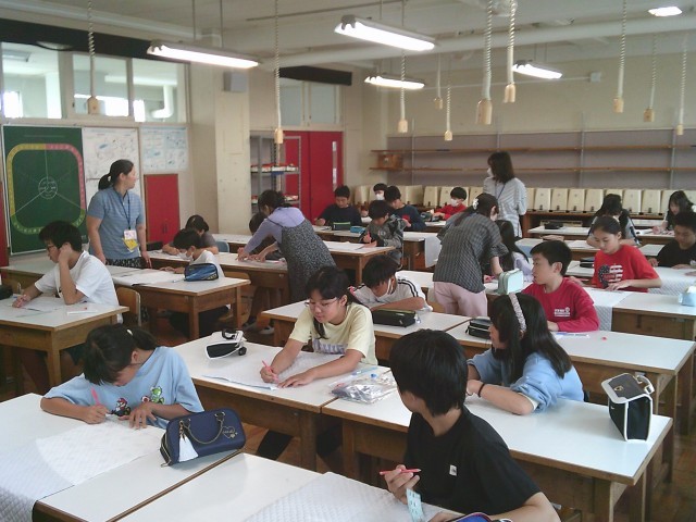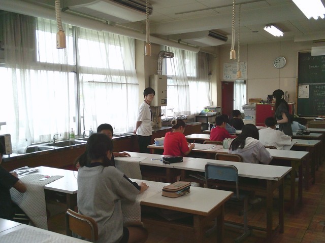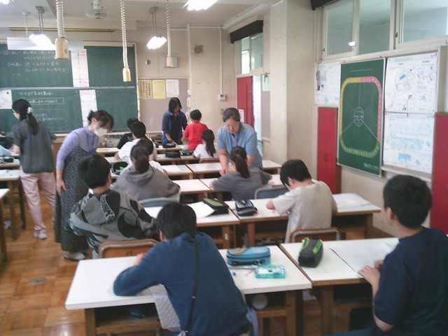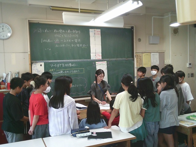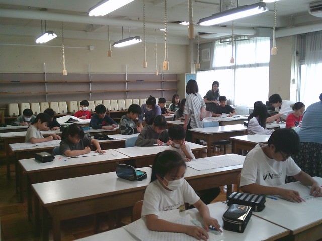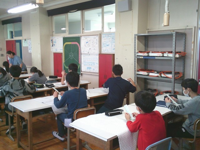 9日(木)3・4時間目、6年1組は家庭科の時間でした。「ソーイングで生活を豊かに」の学習として「ナップザック」づくりに取り組みます。ミシンの使い方を復習してから、ナップザックの裏面に縫い代4cm、口あき5cmにチャコペンでしるしをつけました。子どもたちは先生用の机に集まり、実際に先生がしるしを付けるのを見ました。その後、席に戻り、布を裏返しにしてしるしつけを始めました。ナップザックが完成するまでの間、保護者や地域の皆さまに「ミシンボランティア」としてお越しいただくことになりました。お忙しいなかをありがとうございます。完成までよろしくお願いします。