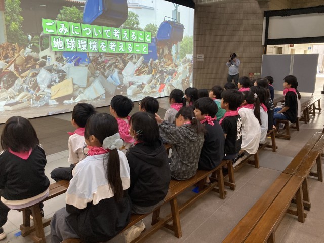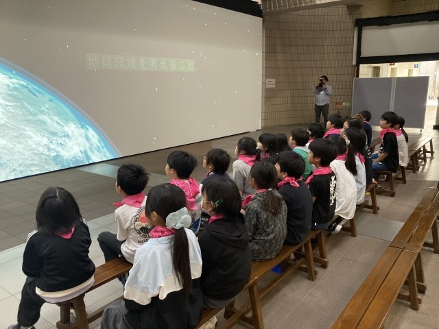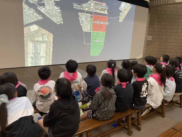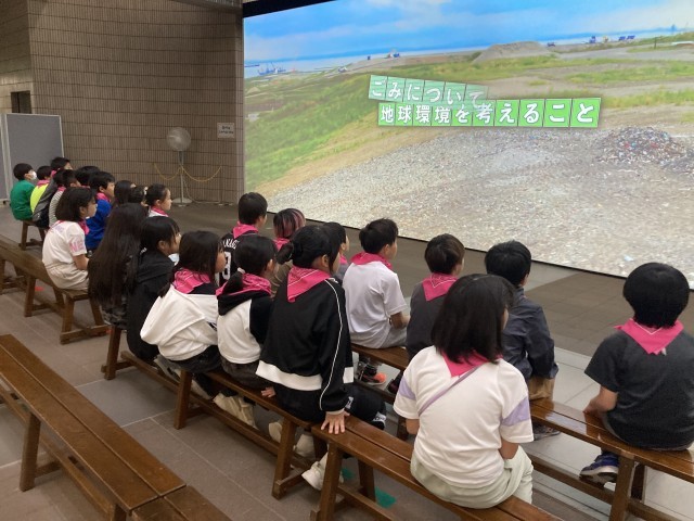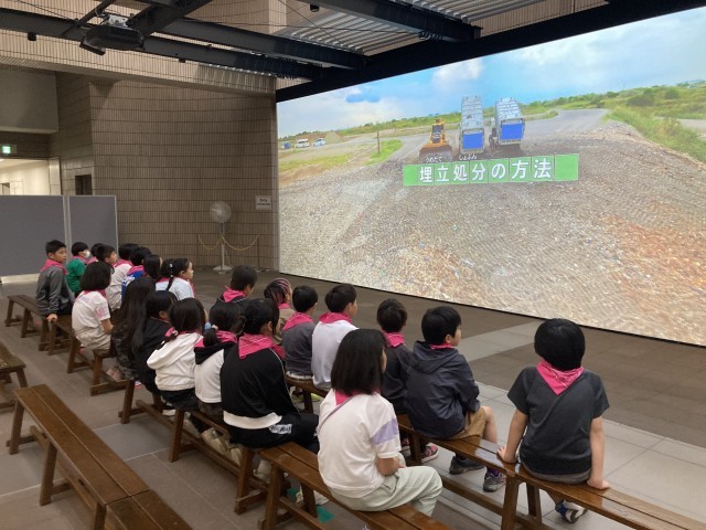 10日(金)午前10時40分過ぎに最初の見学先である「東京都廃棄物埋立処分場」に到着しました。高速道路を走行中、事故渋滞に巻き込まれたため、急遽大黒SAでトイレ休憩、水分補給の時間をとりました。しかし、当初の予定より1時間遅い到着となったために、環境学習ルームだけでの見学となりました。約40分間の学習でしたが、子どもたちは大型スクリーンに登場する様々な映像をよく見ていました。埋立処分場は江東区海の森にありますが、ここが満杯になったら他にはないことを知り、子どもたちは自分たちにできることは何か、考えることができました。