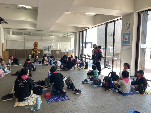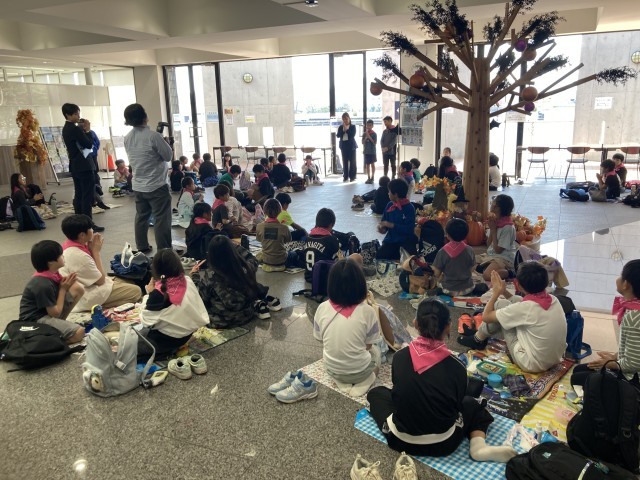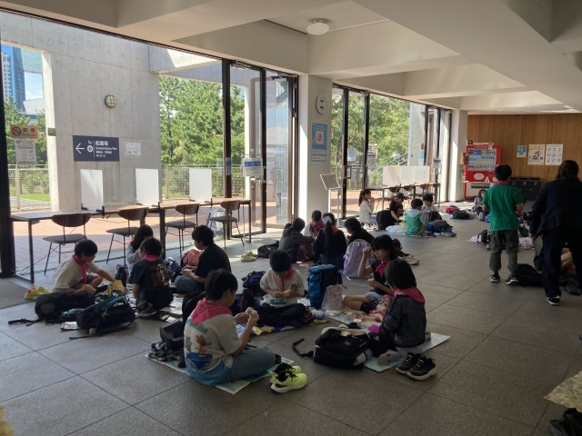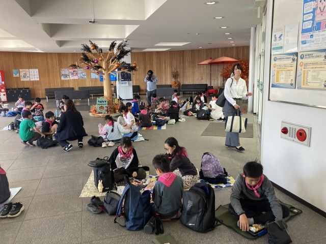 10日(金)午前11時40分、有明客船ターミナルに到着しました。ここで子どもたちが楽しみにしていたお弁当タイムをとりました。雨天でも安心して食事ができる場所として4年生の先生が予約をしていました。グループごとにレジャーシートを広げ、全員で「いただきます」の挨拶をしました。おうちの方が作ってくださったお弁当を喜んで食べていました。早朝からのお弁当の用意をありがとうございました。いつもなら4時間目の授業中ですが、早い時間に食べられることも得した気分と喜んでいました。