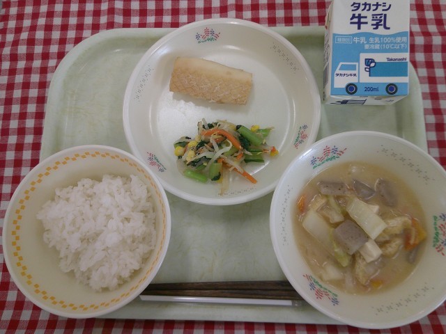 14日(火)の献立は、ご飯、いかのしょうが焼き、野菜のごま酢和え、豆乳仕立ての野菜汁、牛乳です。
