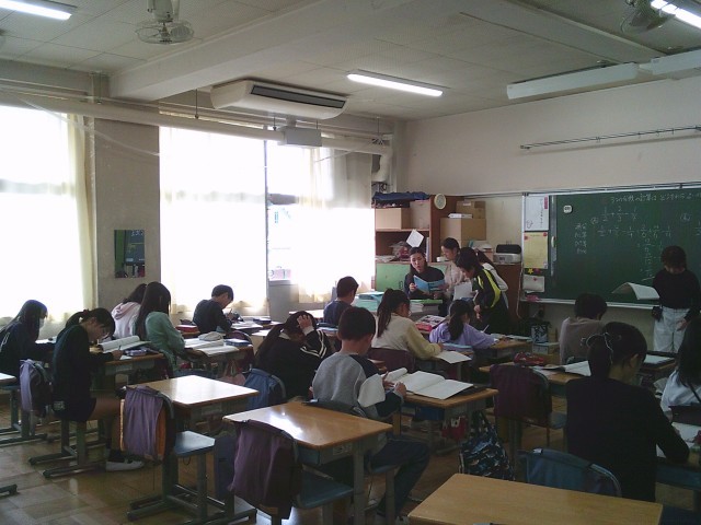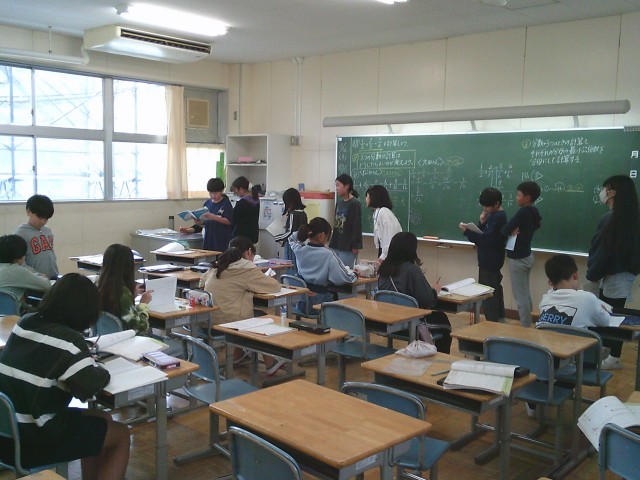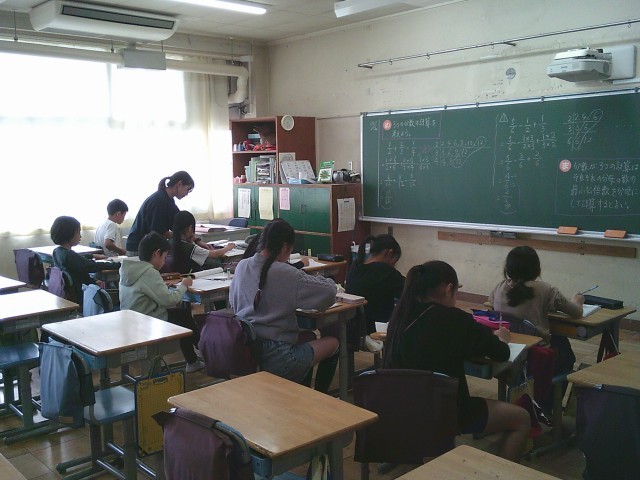 16日(木)4時間目、5年生は算数の時間でした。今回は、「3つの分数の計算のしかたを考えよう」をめあてに取り組みました。3つの分母の最小公倍数を求め、通分してからたしたり、引いたりしました。