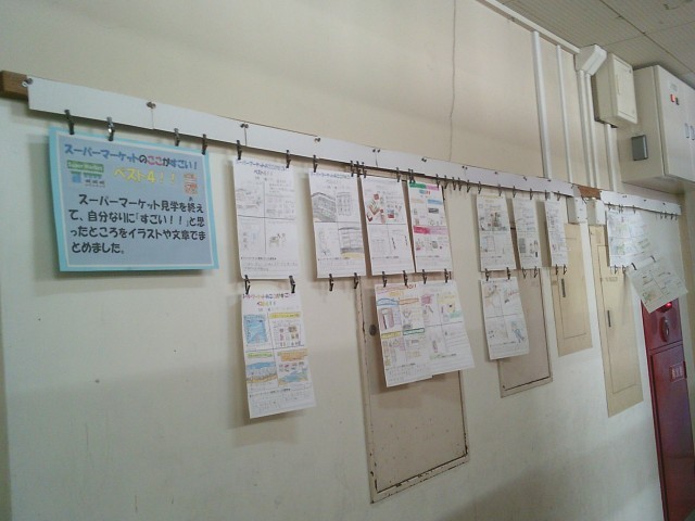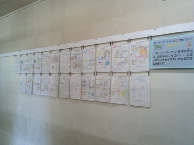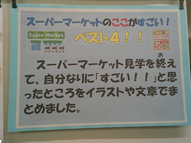 3年生の廊下には「スーパーマーケット見学 ここがすごいベスト4」が登場しました。先日出かけたスーパーマーケット見学から、子どもたちが「すごい」と感じたことを4つ選んで文章とイラストで表現しました。