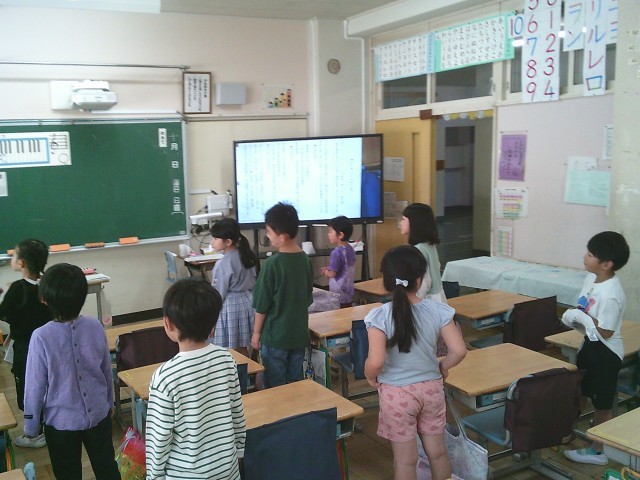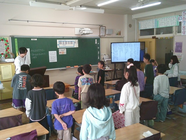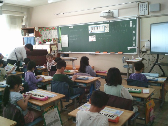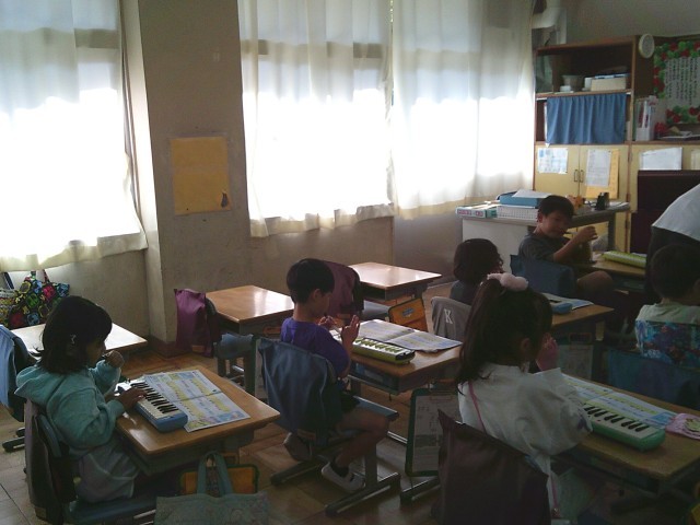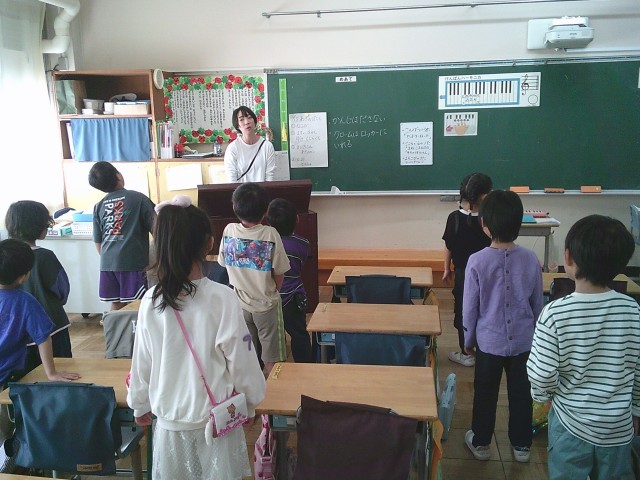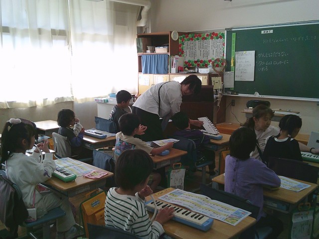 17日(金)1時間目、1年1組は音楽の時間でした。金曜日の音楽は、教室で音楽専科の先生と学習します。最初に、今月の歌「カントリー・ロード」を歌いました。1年生も最後まで歌うことができるようになってきました。次に、「くじらぐも」の歌を2曲練習しました。学習発表会でも披露します。最後に、鍵盤ハーモニカを出して「よろこびの歌」を練習しました。一音ずつ切って音を出すのではなく、続けて音を出すことができるように練習しています。「なめらかにふく」という言葉を習いました。先生が一人ずつ聞いて周り、できた人はシールを貼ってもらいました。