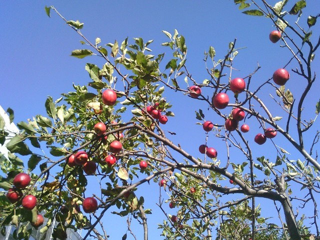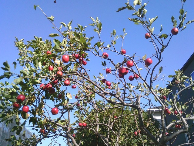 5年生がバケツ稲を育てていた近くに「姫リンゴ」の木があります。今年も赤く色付きました。17日は青空にリンゴの赤色がきれいに映えていました。