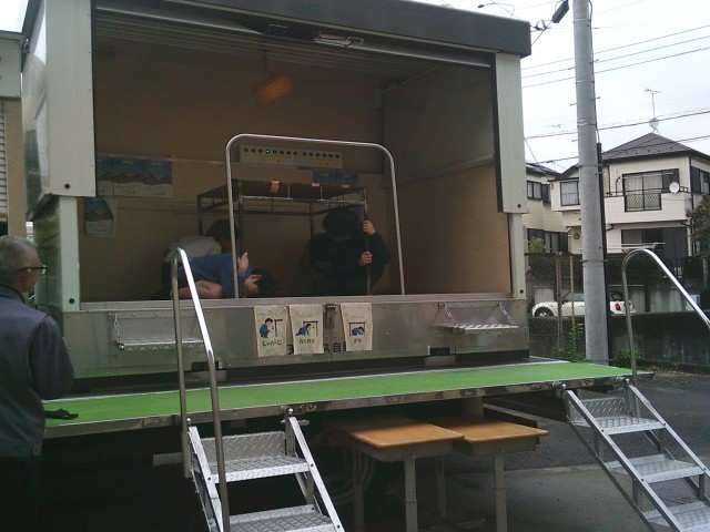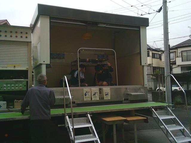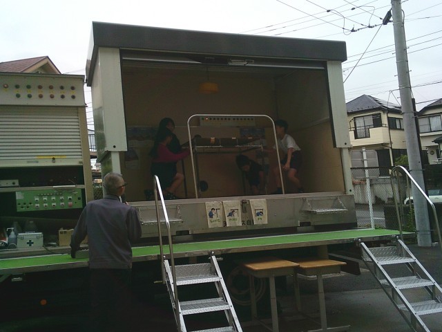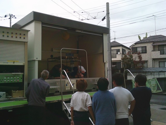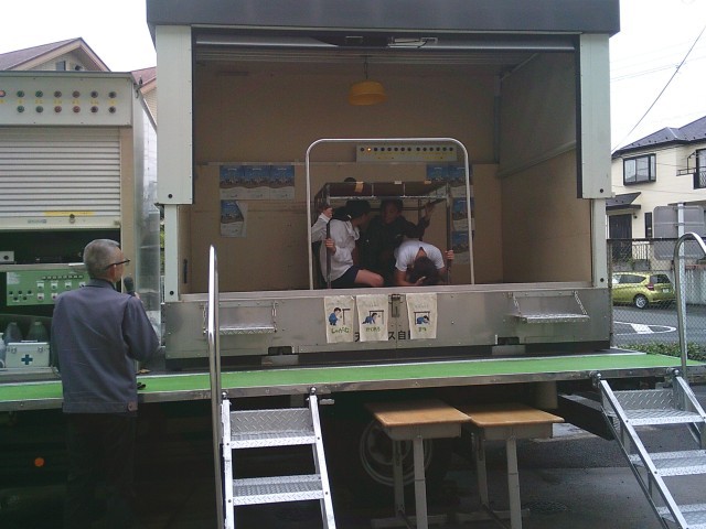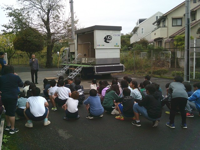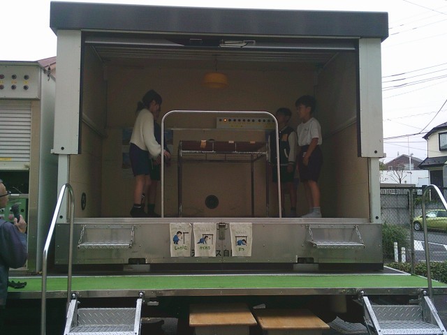20日(月)3時間目、4年生は体育館脇で起震車体験をしました。最初に体験の仕方について話を聞きました。1組から4人ずつ車に乗り、体験をしました。子どもたちは震度3から5強までの揺れを体験しました。