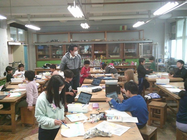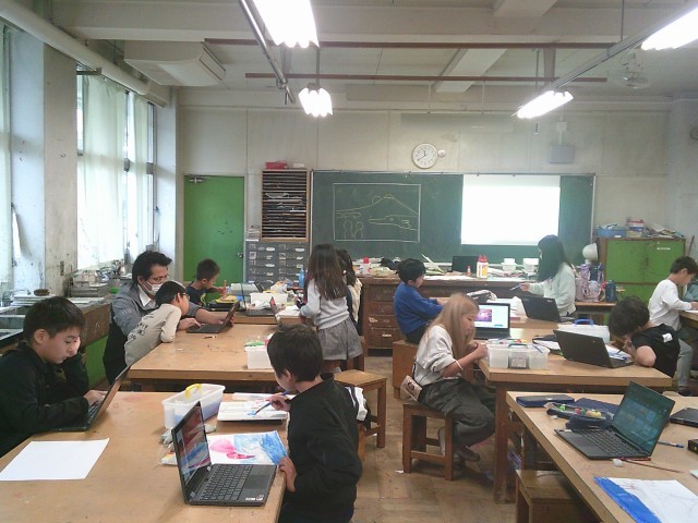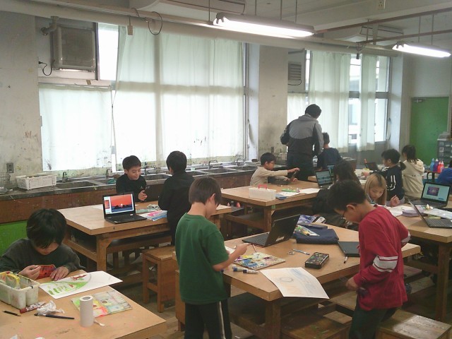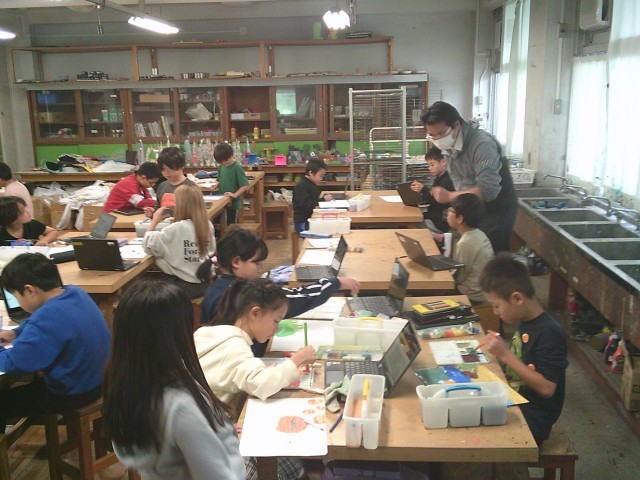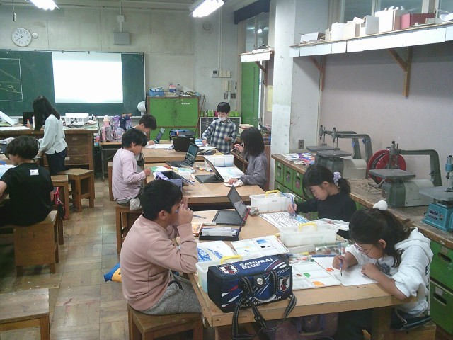 22日(水)3・4時間目、3年1組は図画工作の時間でした。「風景のある絵」に取り組んでいます。風景の描き方を工夫して作品をつくることがめあてです。今回は、近い風景と遠い風景に分けてアイデアを出し、下絵が済んだら絵の具で着彩しました。