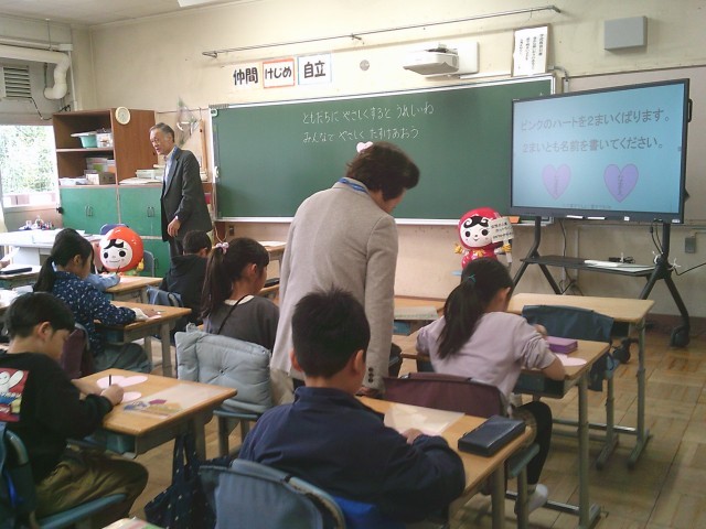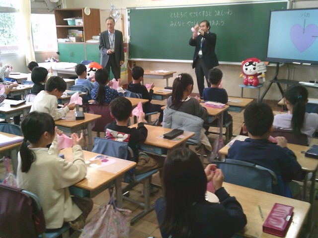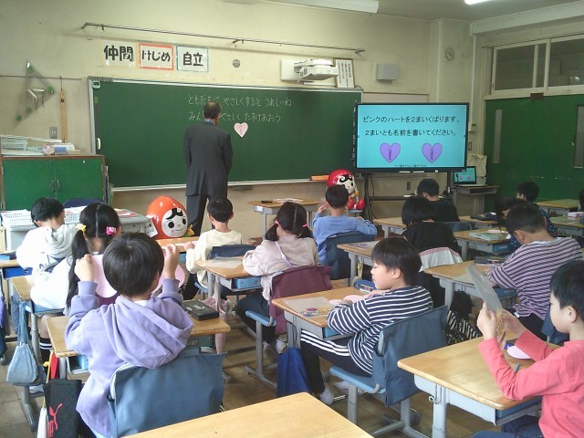 23日(木)4時間目、3年2組は人権教室に参加しました。ハート型に切ってある画用紙を自分の心として、相手から嫌な言葉を言われるたびにハートを握ってくしゃくしゃにしていきました。それを「傷ついた心」とし、いくらきれいにのばしたとしても決して戻らないことに気付きました。