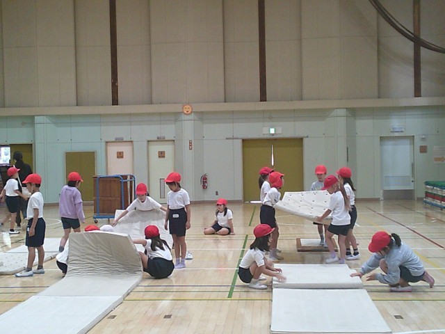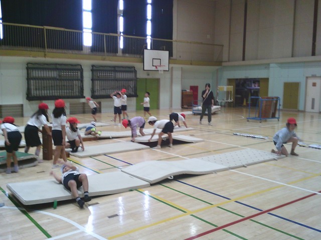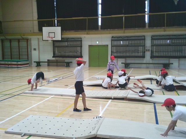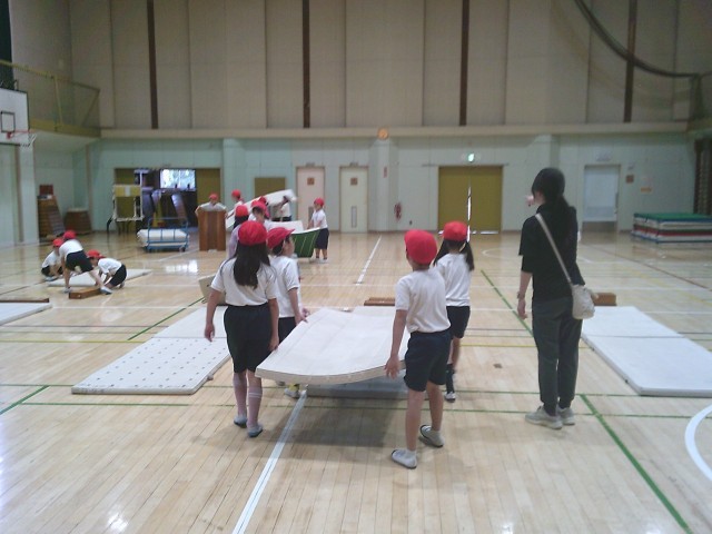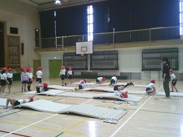 23日(木)5時間目、2年2組は体育の時間でした。マット運動遊びの最終回でした。自分たちでマットや箱を運んで、オリジナルのコースを作りました。その後、子どもたちは順番にできるようになった技を楽しんでいました。