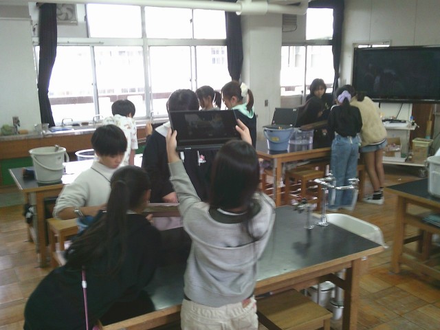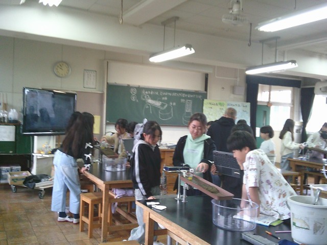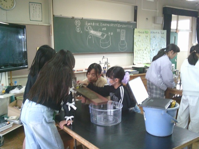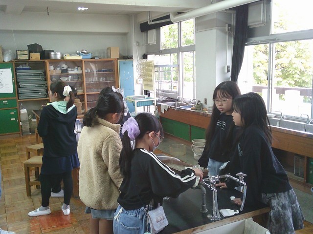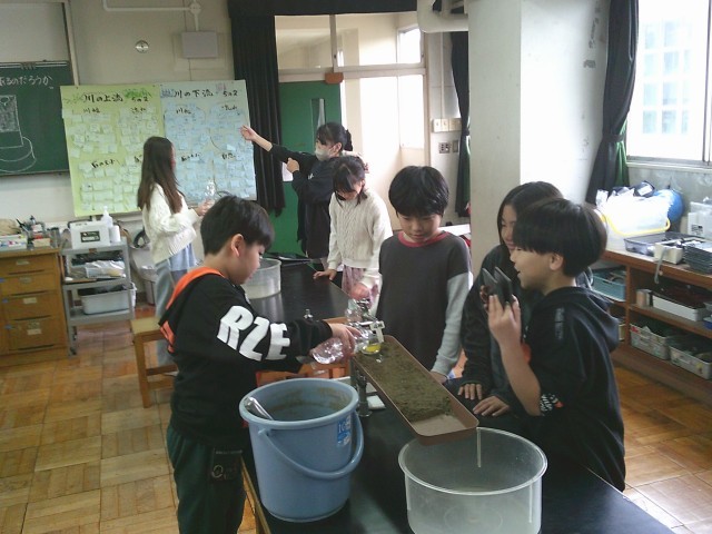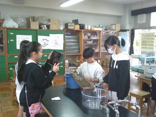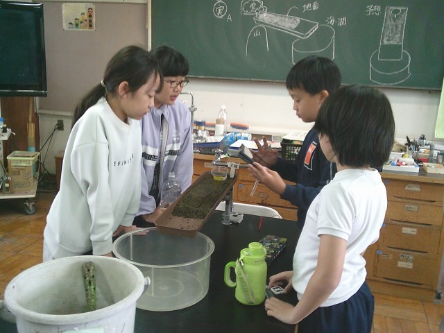 24日(金)1・2時間目、5年2組は理科の時間でした。「流れる水のはたらき」の学習です。今回は、流れる水にはどのような働き(力)があるのかを実験をして調べました。各グループでは、緩やかな斜面をつけた土に水を流しながら、土がどのようになったかを自分の目で確認したり、タブレット端末のカメラ機能で録画したりしました。