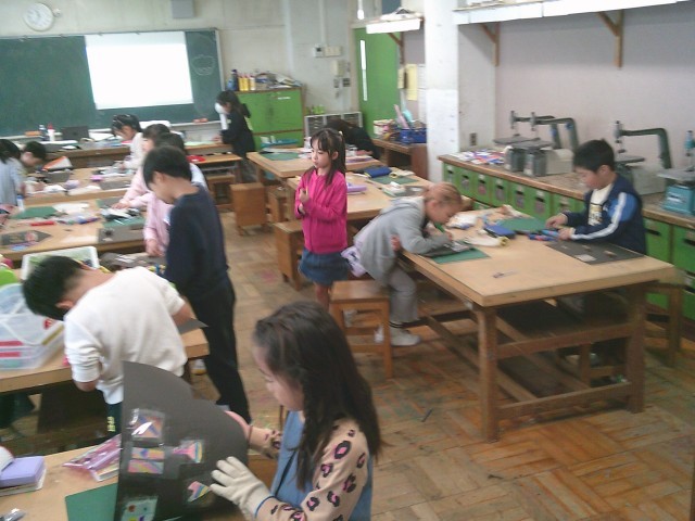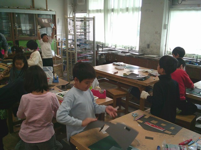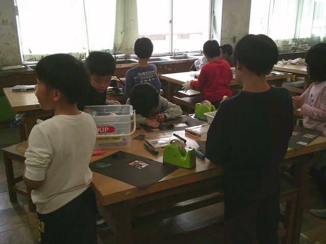 24日(金)3・4時間目、2年2組は図画工作の時間でした。「セロファンでつくろう」の学習です。黒い画用紙にはさみやカッターで窓を作り、セロファンを切って窓に貼りました。子どもたちはマジックを使って、セロファンに絵を描きました。虹を描いたり、動物を描いたりして楽しんでいました。