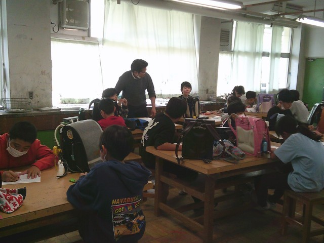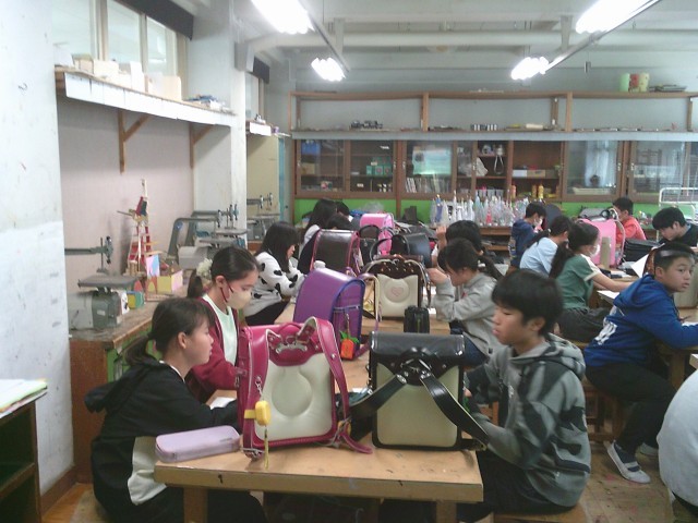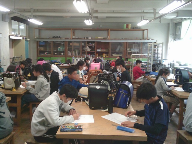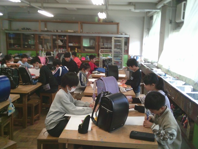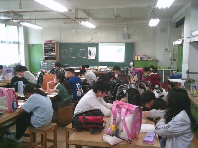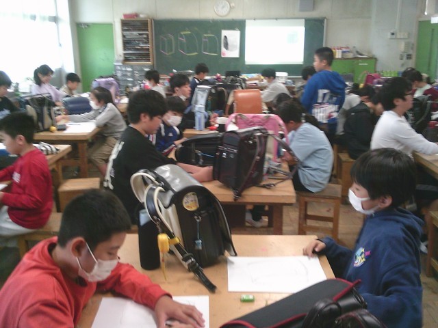28日(火)5・6時間目、6年1組は図画工作の時間でした。「思い出のランドセル」と題して、自分のランドセルを描く学習が始まりました。子どもたちは、ランドセルをどの向きから描いたらよいのかを考え、鉛筆で下描きを始めました。
