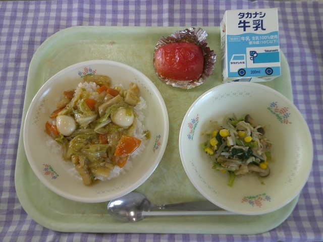 30日(木)の献立は、五目あんかけ丼、青菜ときのこのソテー、焼きりんご、牛乳です。
