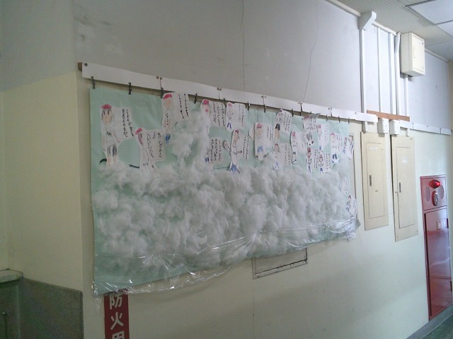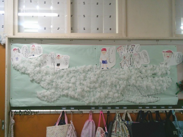 1年生の廊下に大きな「くじらぐも」が登場しました。国語の学習をしながら、くじらぐもに乗ったらどんなものが見えるかな、どんな気持ちになるかなを考えて書きました。