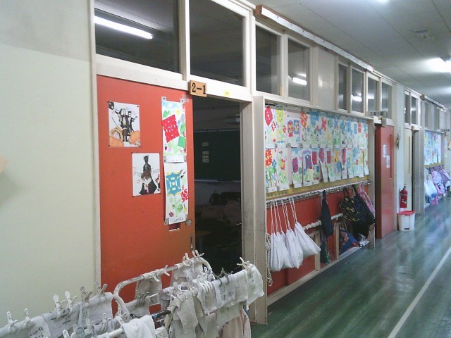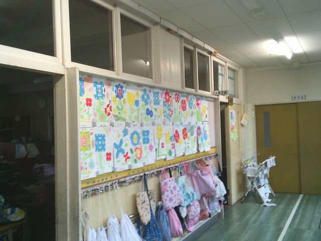 2年生の廊下には、図画工作の時間に作った「大きい花、小さい花」の作品が飾られています。折り紙で作った花がとても色鮮やかできれいです。