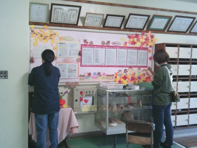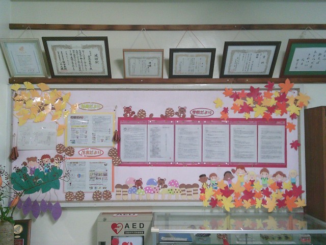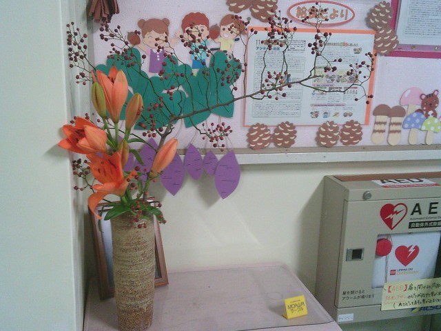 職員玄関にある掲示板は11月用に変わっています。4日(火)にスクールサポートスタッフ、特別教育支援員のお二人が一つ一つ飾っていました。翌5日(水)には、生け花が新しいものになりました。季節の移り変わりを掲示物と生け花からも感じることができます。