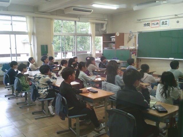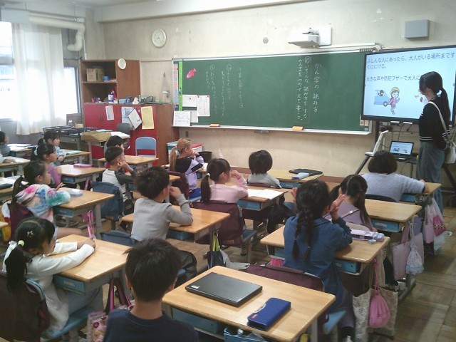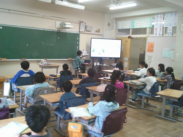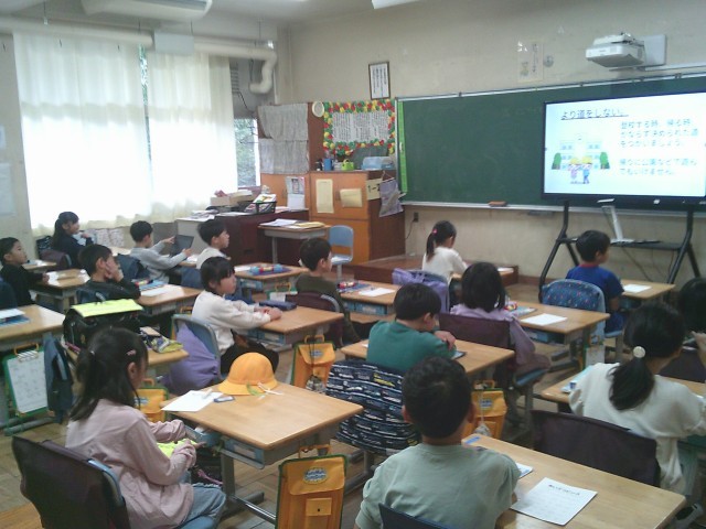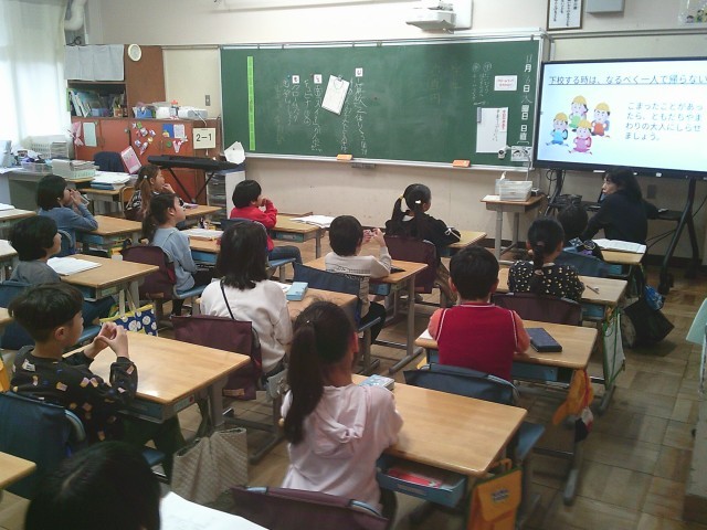 6日(木)高ヶ坂タイムの様子です。第一木曜日は全学級で「安全指導」を実施しています。生活指導担当が作成したスライドを見ながら、子どもたちに話をしています。写真は1年1組から3年2組までの様子です。