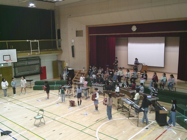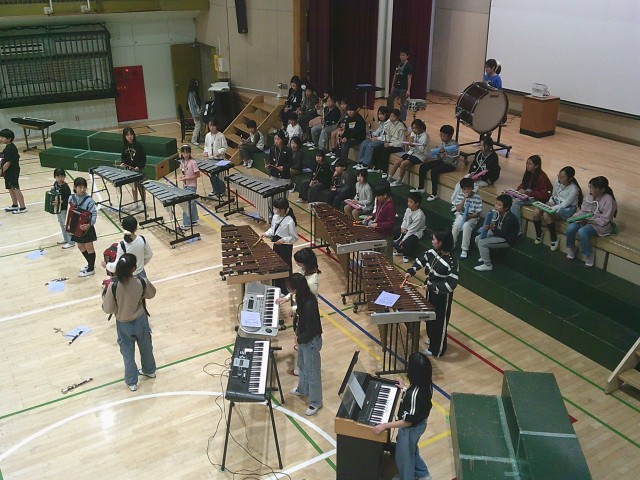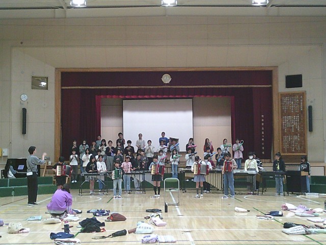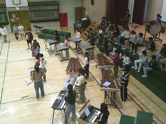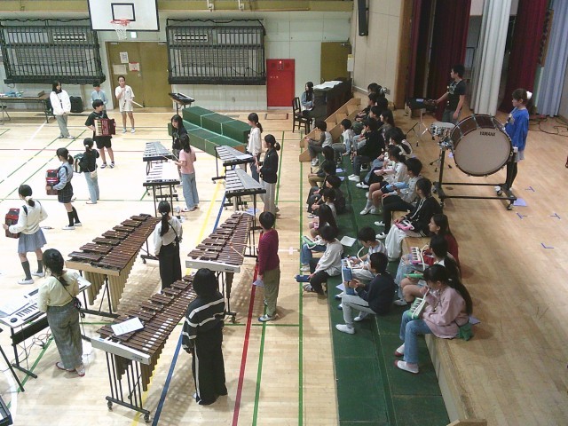 6日(木)5・6時間目、5年生は学習発表会の練習をしました。今回は、合奏の練習です。楽器の配置を確認してから、各場所へ移動しました。写真は楽器紹介の練習をしている様子です。