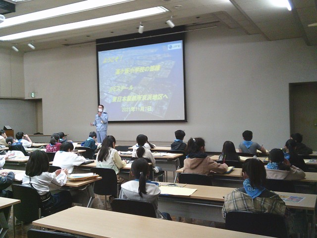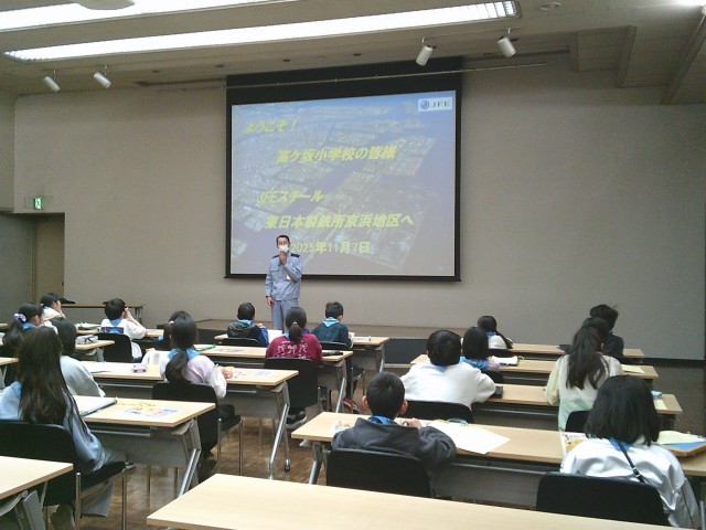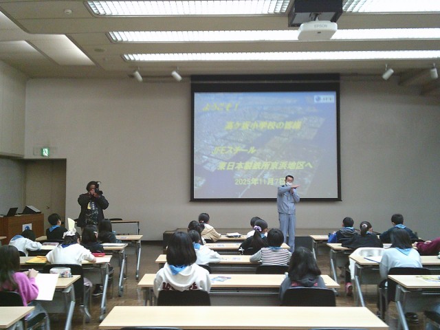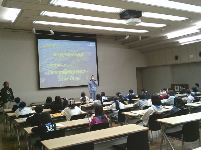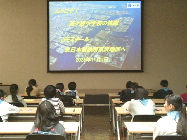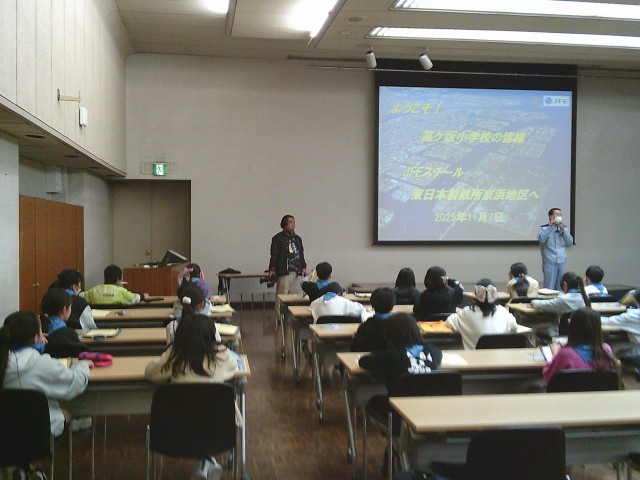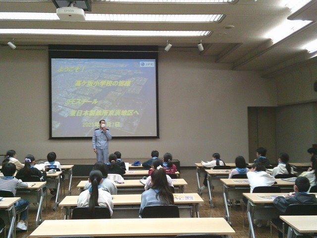 7日(金)午前9時35分、最初の見学地である「JFEスチール東日本製鉄所京浜地区」に到着しました。正門からアメニティホールまでバスで10分かかりました。アメニティホール内だけ写真撮影が許可されています。正面のスクリーンには、「ようこそ 高ヶ坂小学校の皆様」の文字があり、それを見ただけで子どもたちは喜んでいました。ここで約30分、製鉄所についての説明を聞いたり、鉄について学習する動画を見たりしました。子どもたちはしおりにたくさんのメモを残していました。その後、ヘルメットを被ってバスに乗り、説明を聞きながら敷地内を約1時間かけて見学しました。