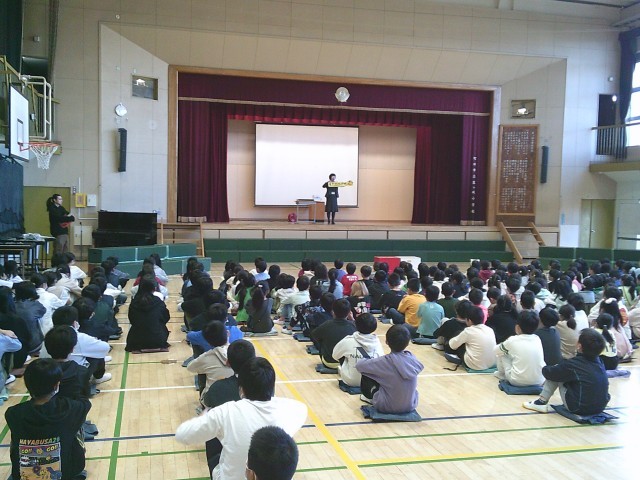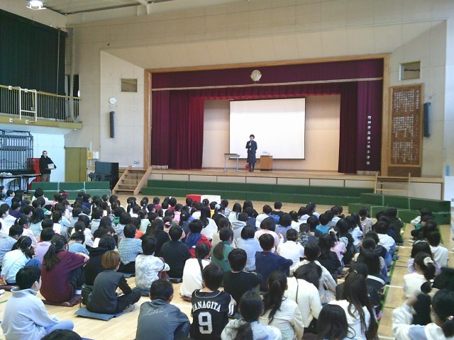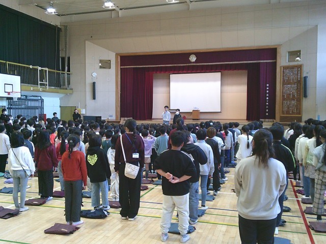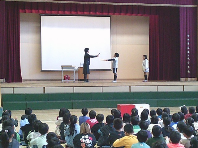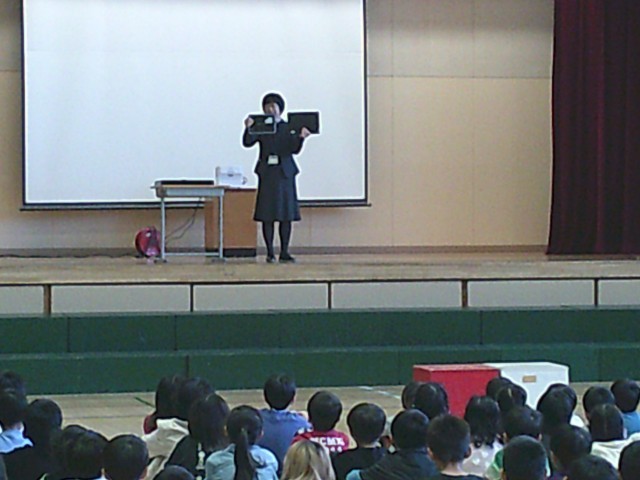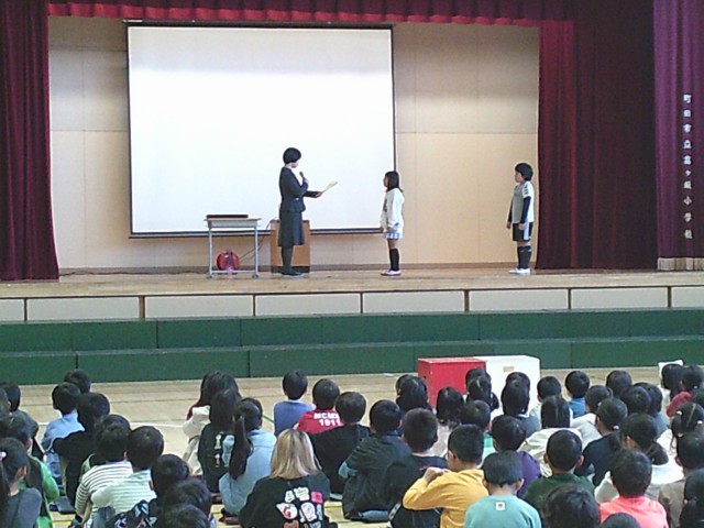 10日(月)、朝会をしました。最初に企画委員の5年生と6年生が挨拶をしました。校長先生の話は、15日(土)から始まるデフリンピックのこと、来週行われる学習発表会のこと、12月から新しいタブレットが使えることでした。最後に、MOA美術館児童作品展において銀賞を受賞した2人の表彰をしました。