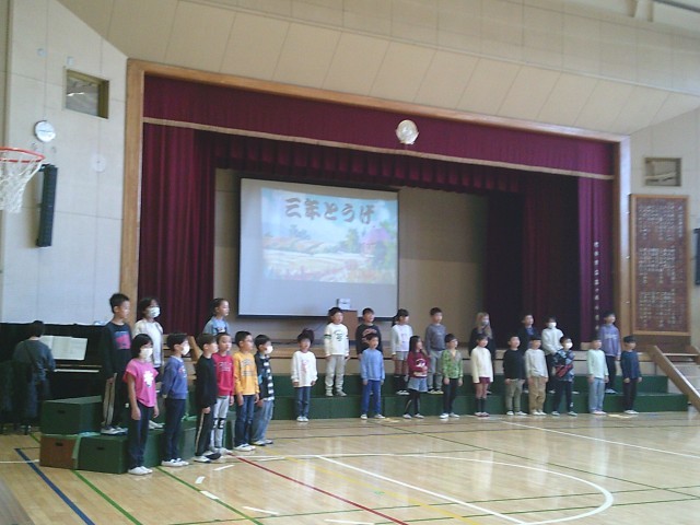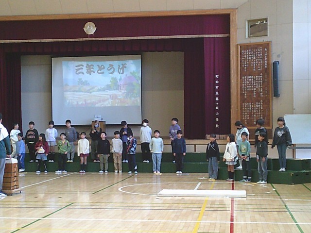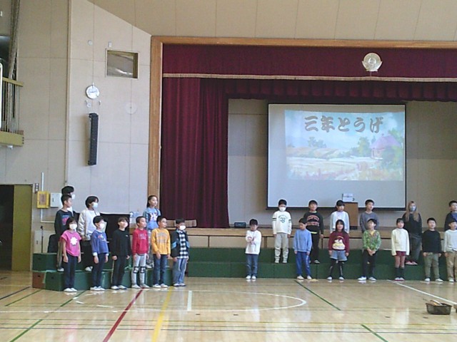 10日(月)1時間目、3年生は学習発表会の練習をしました。音楽の先生も加わって、ピアノ伴奏に合わせて歌を歌いながら、音読劇を進めていきました。